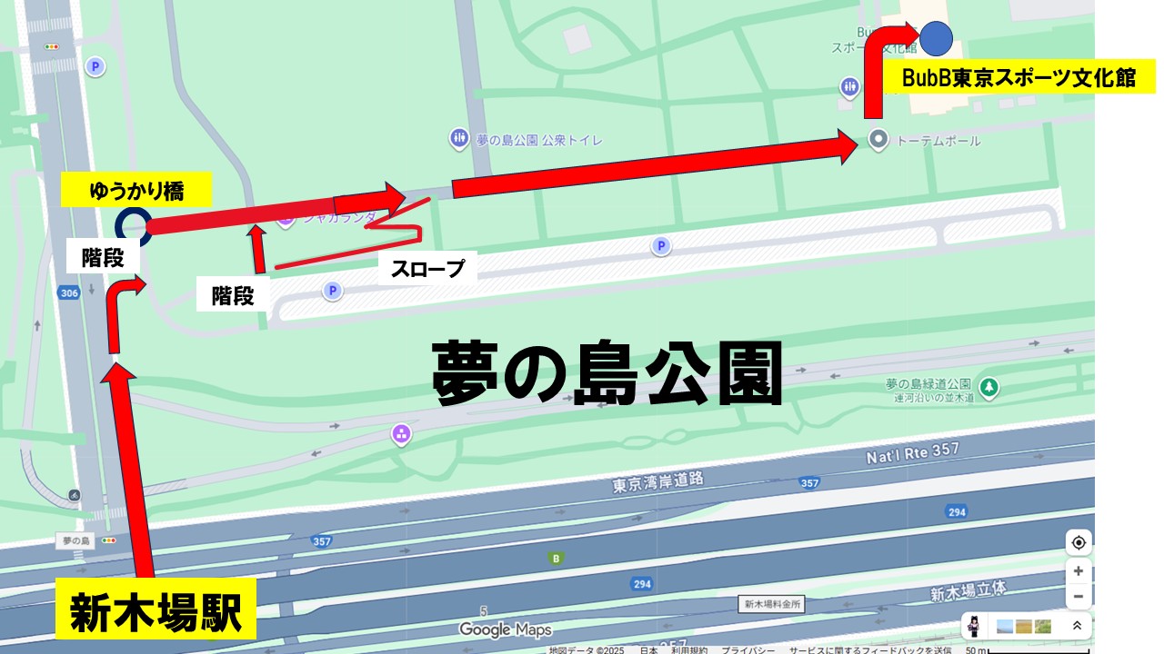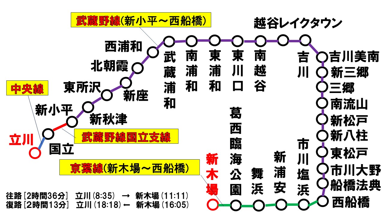 JR立川駅↔(中央線・国立支線・武蔵野線・京葉線 経由)↔JR新木場駅駅←(徒歩)→夢の島公園