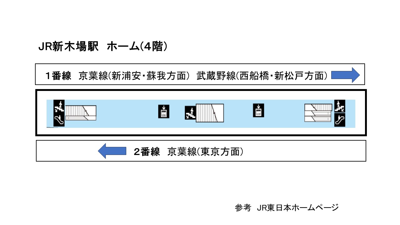 JR新木場駅は、島式ホーム1面2線を有する高架駅です。JR京葉線(武蔵野線直通を含む)、東京メトロ有楽町線、りんかい線が乗り入れており、3社の駅が同一フロアに隣接しています。
