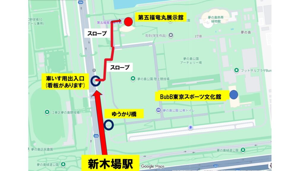 ⇒直進して、車いす用入口から「第五福竜丸展示館」に向かいます。