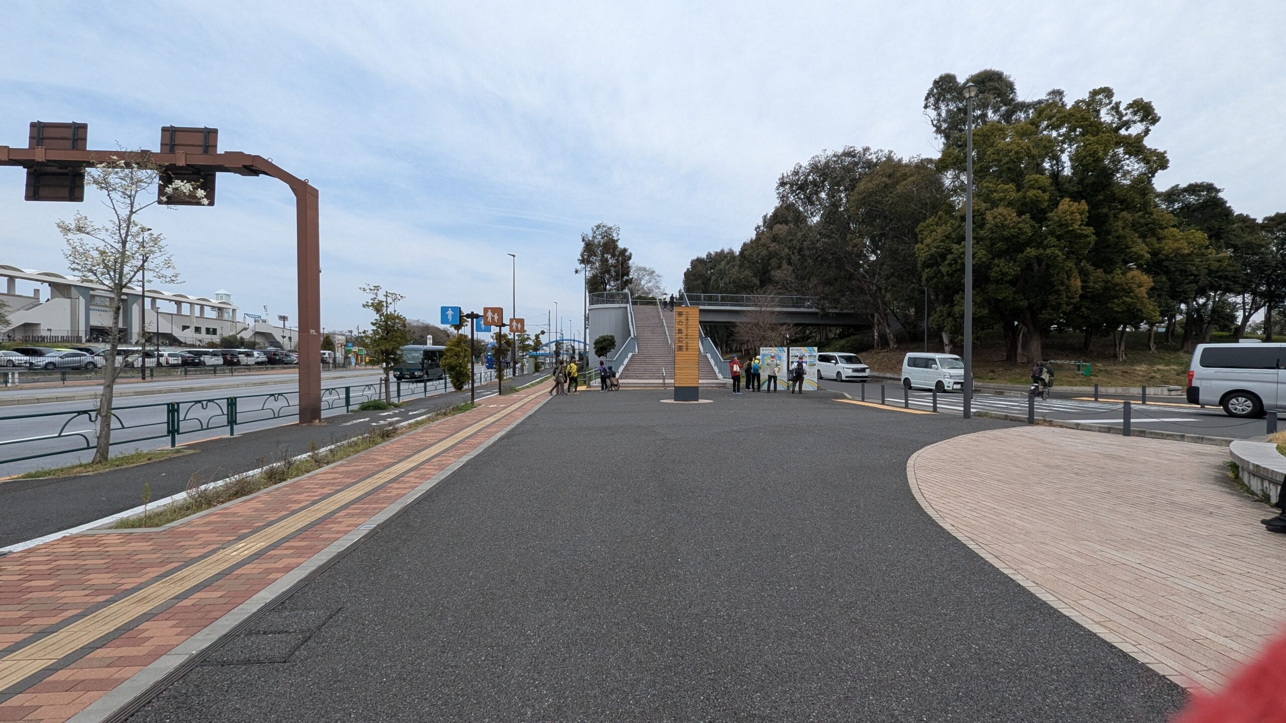 ◎京葉線と首都高速湾岸道線の二つのガードを潜ります。2カ所の横断歩道があります。交通量は多くはなく、青信号の時間も長めです。二つ目の横断歩道の先が夢の島公園です。