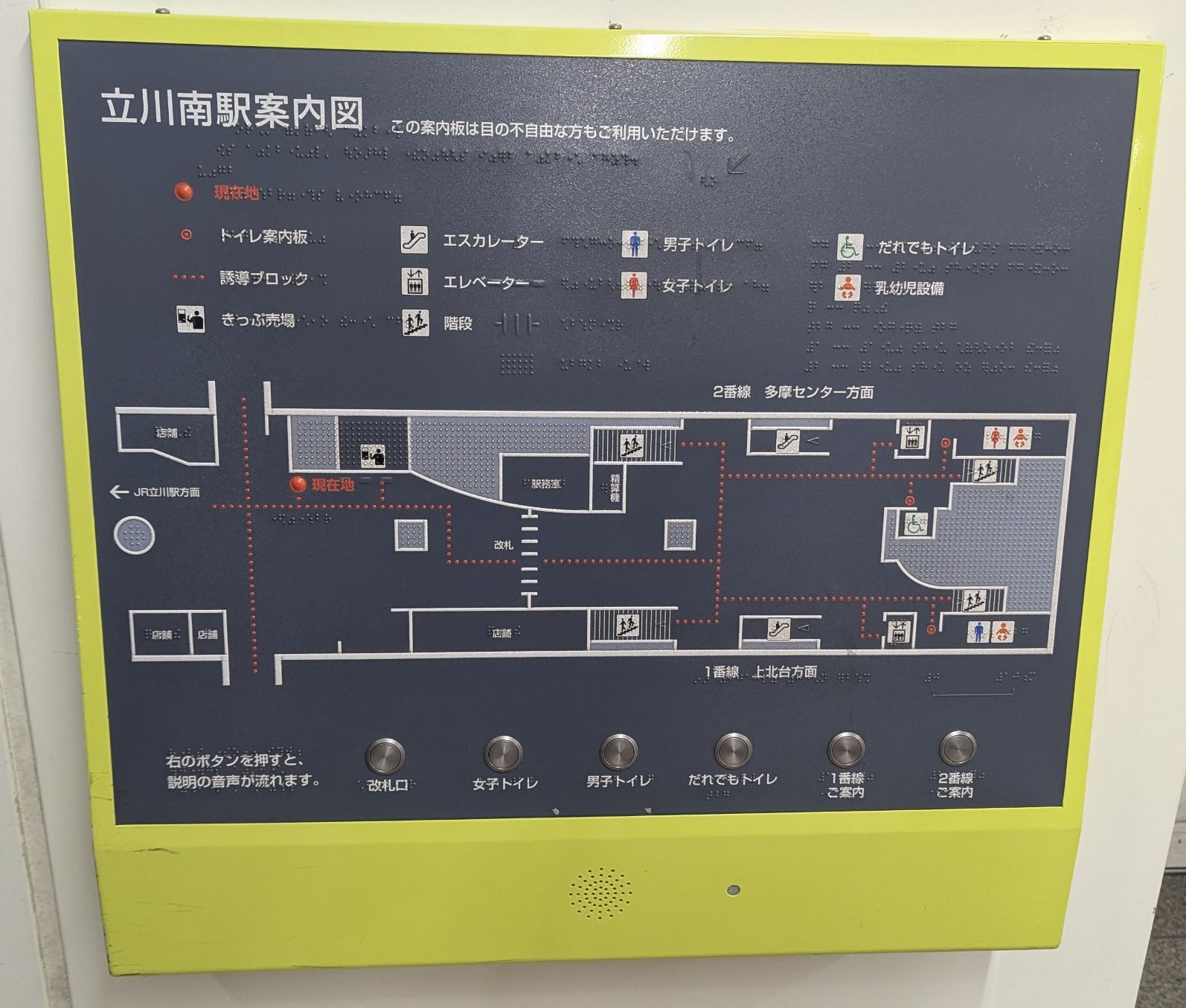 立川南駅には、上記の設備以外にも以下のバリアフリー設備が完備されています。