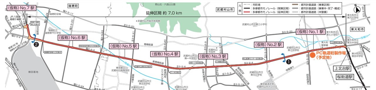 現在、上北台駅から箱根ケ崎駅(瑞穂町)方面への約7.1kmの延伸計画が進められており、この区間内に7つの新駅が設置される予定です。これにより、東京都内で唯一鉄道が走っていない武蔵村山市にも駅ができ、地域の交通利便性の向上が期待されています。